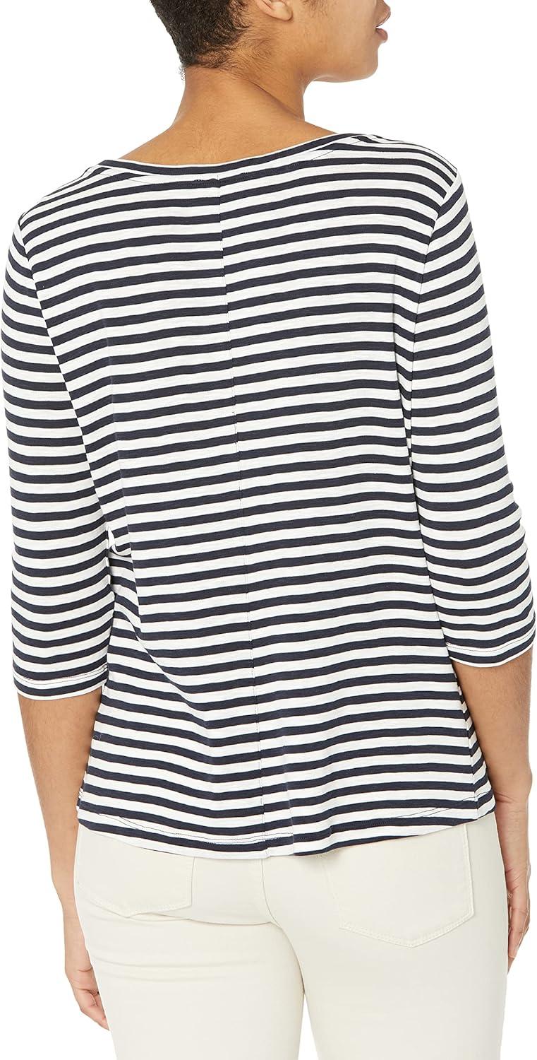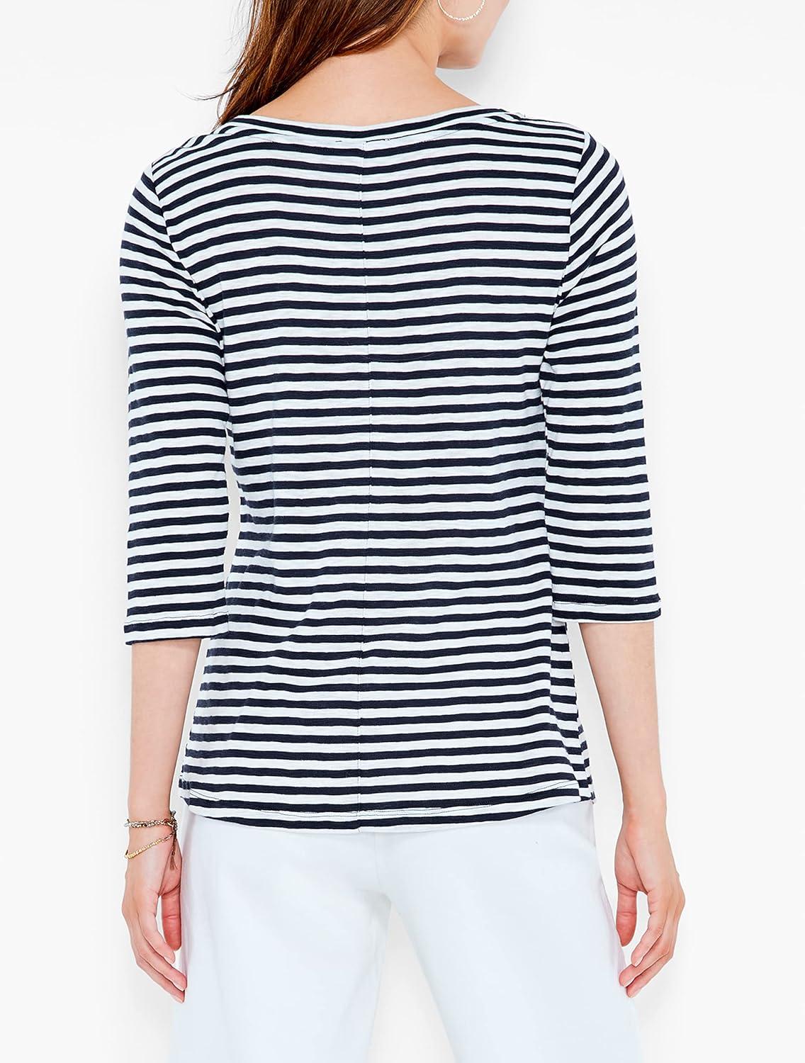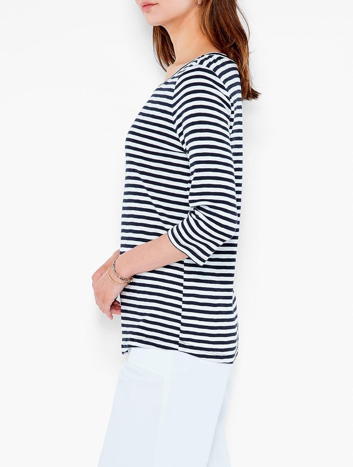 Simple but so sweet this is a playful iteration of our classic ¾ boat tee. We added knit in stripes in a variety of colors for a feminine twist on a well-loved classic. The fit is easy and feminine with the signature demi-boat neckline and ¾ sleeve. We made it with our cotton modal fabric for lightweight comfort.