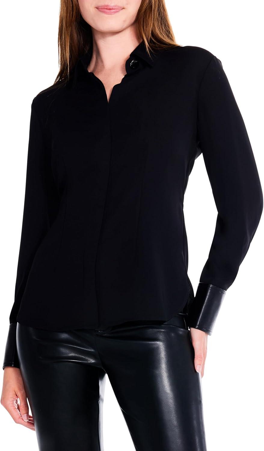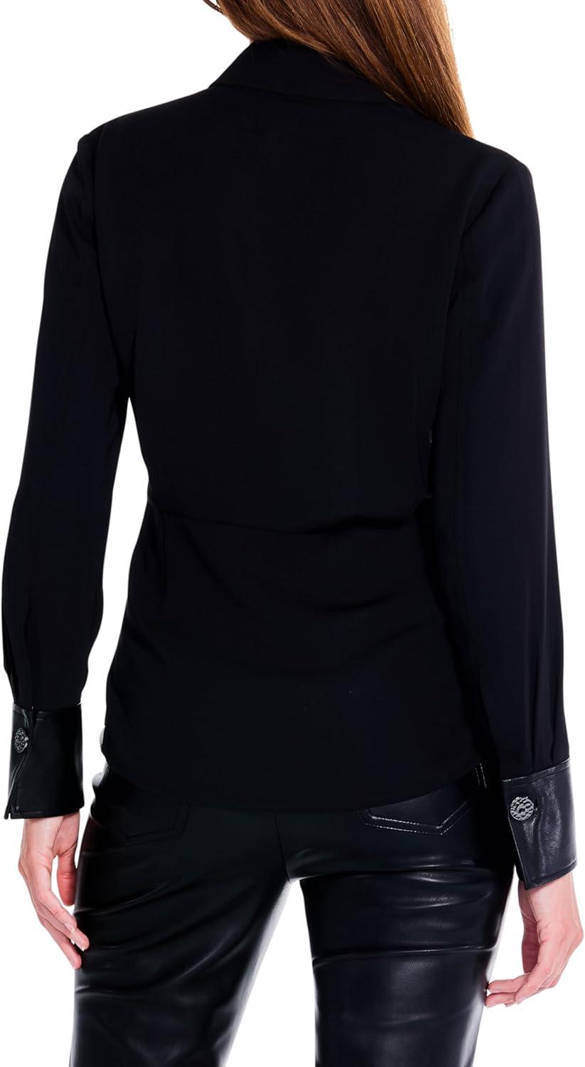 Everyone needs at least one black top, but not all are created equal. Subtle detailing sets this top apart from the rest of your closet. The vegan leather cuffs, hidden placket, button details, and contrast trim add some subtle chicness and a touch of character while remaining true to the legendary style. Designed for a regular fit, but with pleat details on the back that give it some feminine shape. With a little extra length that takes the hem below the hip.